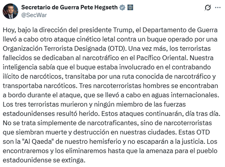 El Secretario de Guerra Pete Hegseth anunció este miércoles el ataque y posterior eliminación de una embarcación en el Pacífico oriental, la cual era tripulada por tres hombres. La declaración fue realizada a través de su cuenta oficial en X, en la que afirmó "una vez más, los terroristas fallecidos se dedicaban al narcotráfico".