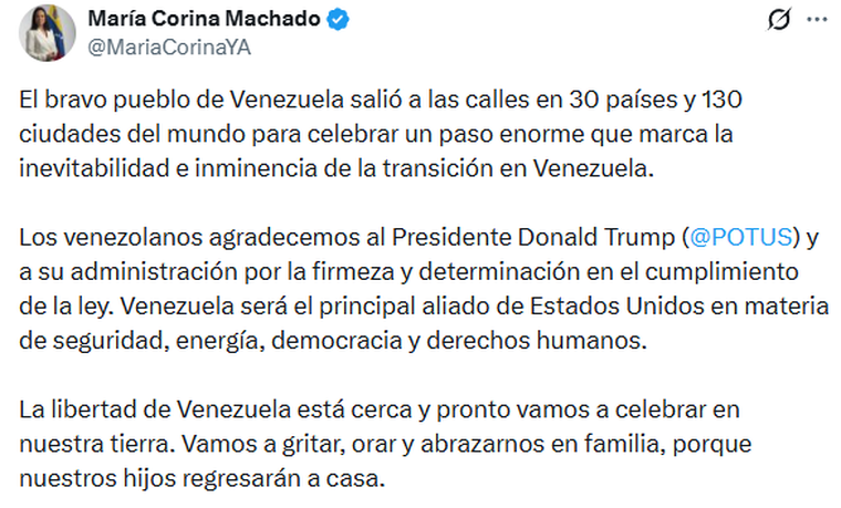 En ese marco, señaló que la Justicia, el Poder Ejecutivo y las fuerzas de seguridad venezolanas “son parte del problema” y deberán ser reformadas para garantizar un verdadero Estado de derecho. La presencia de la ministra en el Obelisco fue recibida con aplausos por los manifestantes, en una jornada cargada de consignas por la libertad, la justicia y la reconstrucción democrática de Venezuela.