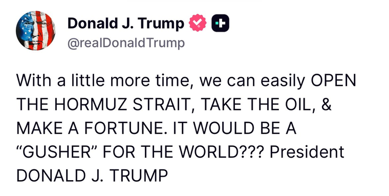 Donald Trump escaló este viernes su retórica contra Irán con una publicación en su plataforma Truth Social en la que afirmó: "Con un poco más de tiempo, podemos abrir fácilmente el estrecho de Ormuz, extraer el petróleo y hacernos ricos", escribió el mandatario.