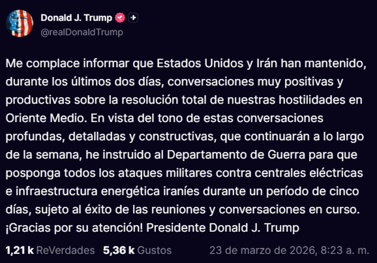 Fiel a su estilo, Trump utilizó su red social, Truth Social, para comunicar la noticia en un mensaje escrito íntegramente en mayúsculas. En el posteo, aseguró que las conversaciones mantenidas durante las últimas 48 horas han sido "profundas, detalladas y constructivas", lo que motivó la orden directa al Departamento de Guerra para posponer las represalias.