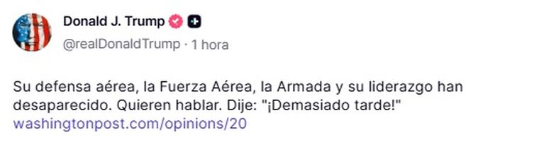El presidente de Estados Unidos, Donald Trump, aseguró que ya es “ demasiado tarde” para entablar conversaciones con Irán, incluso si el régimen iraní busca abrir un canal diplomático en medio de la escalada militar.