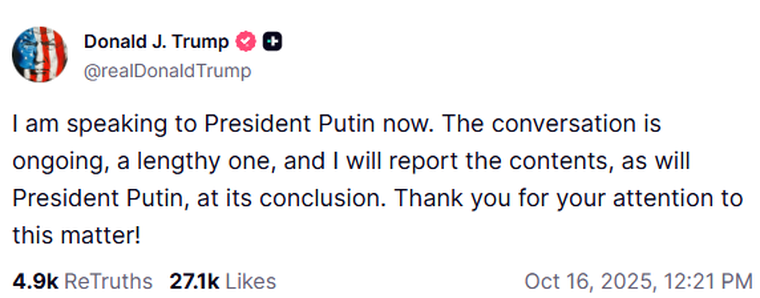 Por su parte, Donald Trump escribió en su red Truth Social que él dará el parte de lo hablado en su conversación con Putin cuando esta finalice: "La conversación está en curso, es larga, y yo informaré de su contenido, como también lo hará el presidente Putin, cuando concluya"