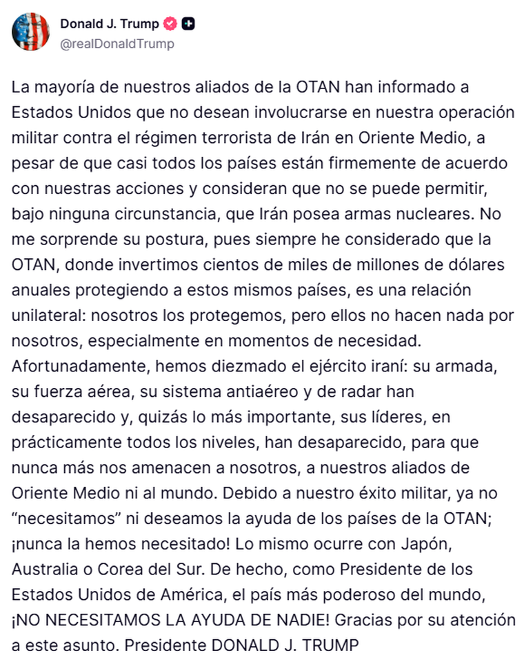 "Ya no 'necesitamos' ni deseamos la ayuda de los países de la OTAN": el descargo de Trump