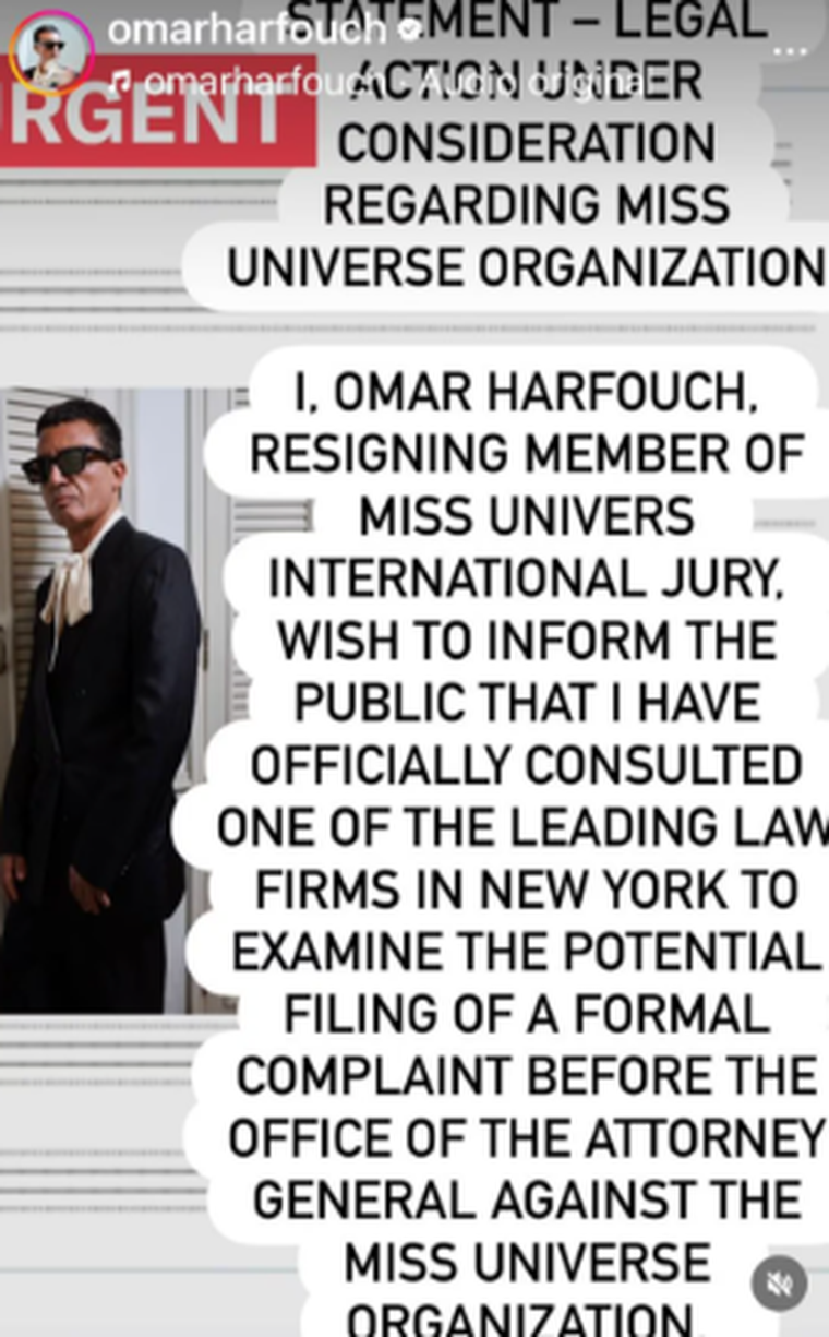 El pianista y compositor franco-libanés Omar Harfouch confirmó su salida del panel de ocho jueces a través de su cuenta de Instagram, donde también anunció que evalúa iniciar acciones legales contra la Organización Miss Universo (MOU, por sus siglas en inglés). Harfouch cuestionó el proceso de preselección de las participantes, al que calificó de irregular. Recordemos que, en esta edición, compiten 120 concursantes, de las cuales, solo una será la elegida para llevar la corona de la actual reina, la danesa Victoria Kjaer.