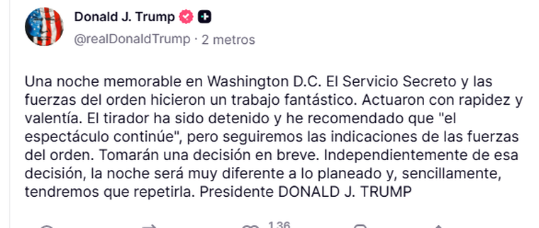 El presidente de EE.UU. escribió en redes sociales este sábado que "un tirador ha sido detenido" y aseguró que ha recomendado que el evento no se suspenda.