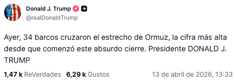 El presidente Donald Trump volvió a provocar a Irán desde su cuenta de Truth Social este lunes al publicar que "ayer, 34 barcos cruzaron el estrecho de Ormuz" desde el inicio del cierre del canal por el que pasa el 20% del petróleo a nivel mundial.