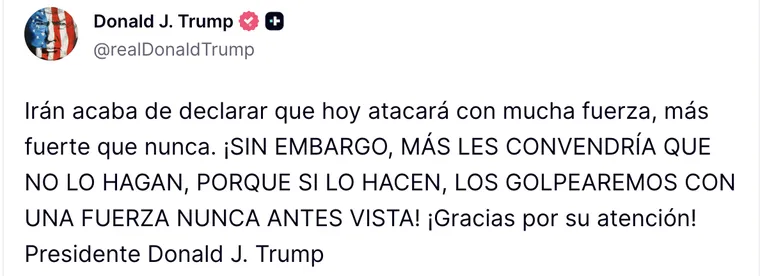 En una publicación en Truth Social, Donald Trump comentó: “Irán acaba de declarar que hoy va a atacar muy fuerte, más fuerte que nunca antes”.