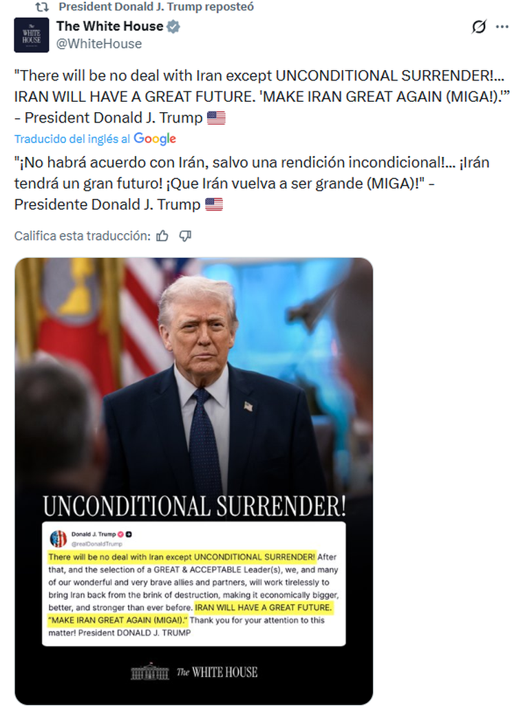 DPADonald Trump declaró este viernes que “no habrá acuerdo con Irán, salvo una rendición incondicional”. El conflicto abierto tras la operación "Furia Épica", conjunta con Israel, parece distanciarse cada vez más de aquella maniobra ejecutada por Washington en Caracas. Lejos de un golpe rápido, Irán arrastra a Estados Unidos a una guerra, hasta el momento, más extensa de lo esperado.