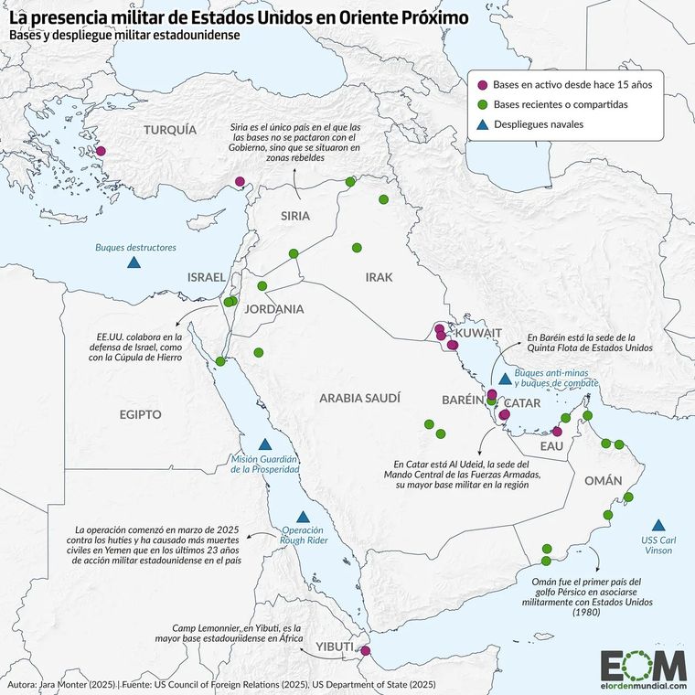 La arquitectura militar estadounidense en la región —con bases, destacamentos y acuerdos de defensa— hizo que varios socios de Washington quedaran inmediatamente expuestos.