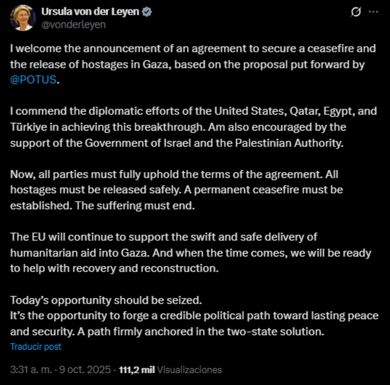 La presidenta de la Comisión Europea, Ursula von der Leyen, celebró el entendimiento alcanzado entre ambas partes y remarcó la necesidad de que se cumplan todos sus compromisos. “Doy la bienvenida al anuncio de un acuerdo”, expresó, y destacó los esfuerzos diplomáticos que lo hicieron posible. Además, subrayó la importancia de liberar a los rehenes y consolidar un proceso de paz duradero.