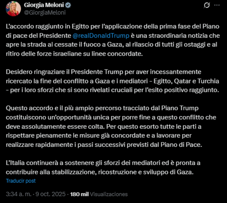 Por su parte, la primera ministra italiana, Giorgia Meloni, agradeció al presidente Trump por “abrir el camino” hacia un cese del fuego. “Es una extraordinaria noticia que abre la puerta a la paz, la liberación de todos los rehenes y la retirada del Ejército israelí de las líneas acordadas”, señaló. Meloni consideró además que el pacto “brinda una oportunidad única” para poner fin al conflicto y pidió a las partes “cumplir plenamente con las medidas acordadas y avanzar hacia las siguientes etapas del plan”.