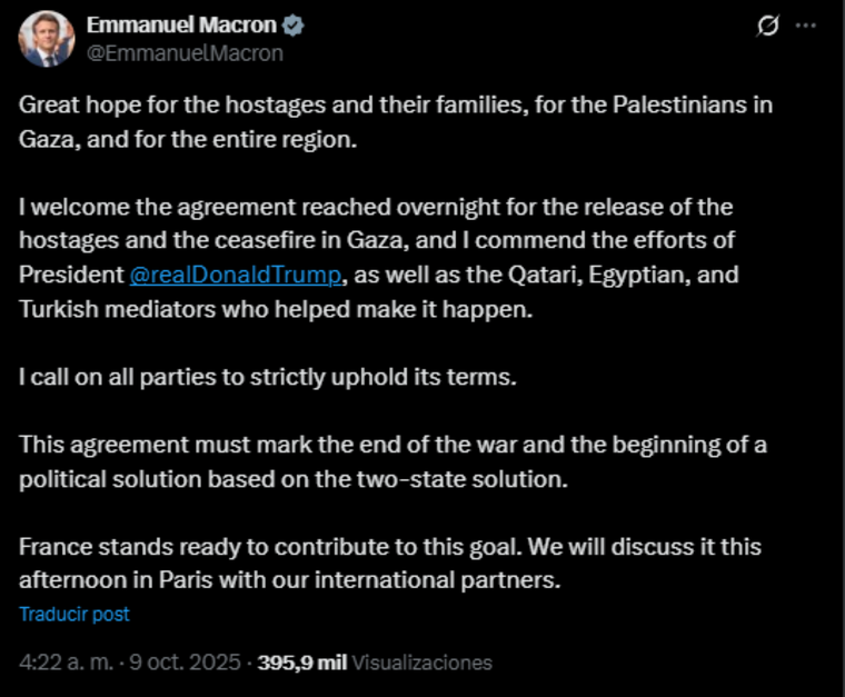 Finalmente, el mandatario francés, Emmanuel Macron, se refirió al acuerdo en el marco de su postura reciente a favor del reconocimiento de un Estado palestino ante la ONU. Según dijo, espera que este entendimiento “permita avanzar hacia una solución política de dos Estados una vez que se haya puesto fin al conflicto entre Israel y Hamas”.