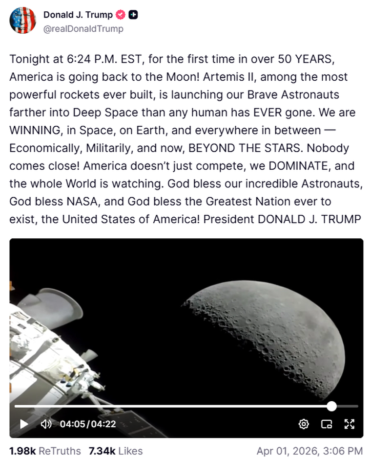 En su cuenta de la plataforma Truth Social, el presidente de los Estados Unidos en la que adelantó que "por primera vez en más de 50 años, Estados Unidos regresa a la Luna! Artemis II, uno de los cohetes más potentes jamás construidos" y "lanzará a (sus) valientes astronautas más lejos en el espacio profundo de lo que ningún ser humano ha llegado jamás".