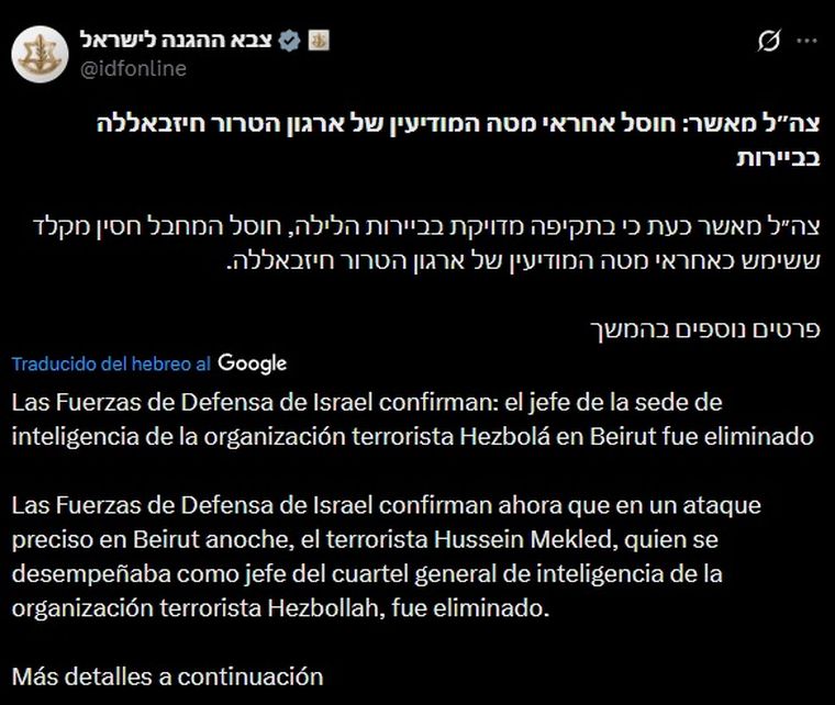 En paralelo, las Fuerzas de Defensa de Israel (FDI) confirmaron que abatieron en Beirut al jefe del cuartel general de inteligencia de Hezbolá.