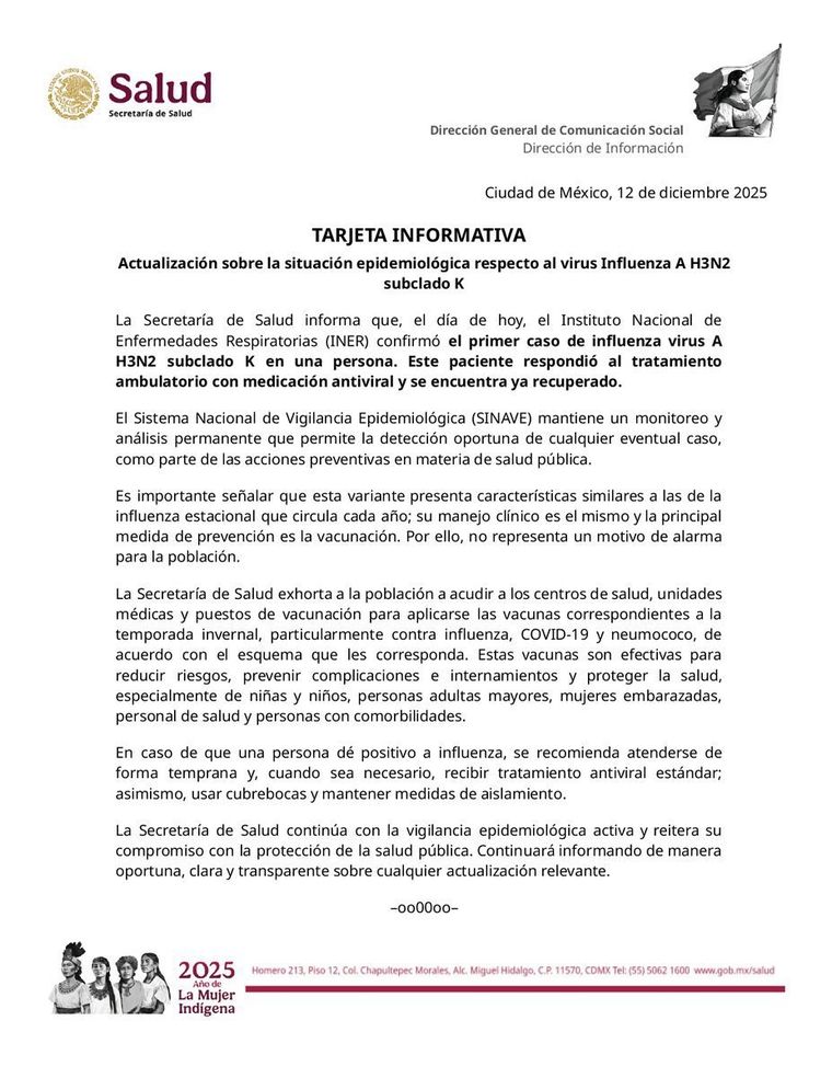 La Secretaría de Salud de México confirmó este viernes el primer caso de gripe A H3N2 subclado K, conocida mediáticamente como “súper gripe K”. El diagnóstico fue realizado por el Instituto Nacional de Enfermedades Respiratorias (INER), que informó que el paciente recibió tratamiento antiviral ambulatorio y ya se encuentra recuperado.