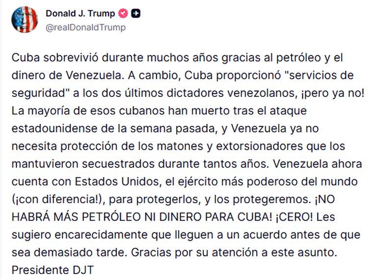 El mensaje fue difundido a través de su red social, Truth Social, donde el mandatario sostuvo que la isla ha sostenido su economía durante años gracias al apoyo venezolano. "Cuba proporcionó "servicios de seguridad" a los dos últimos dictadores venezolanos, ¡pero ya no!", explicó.