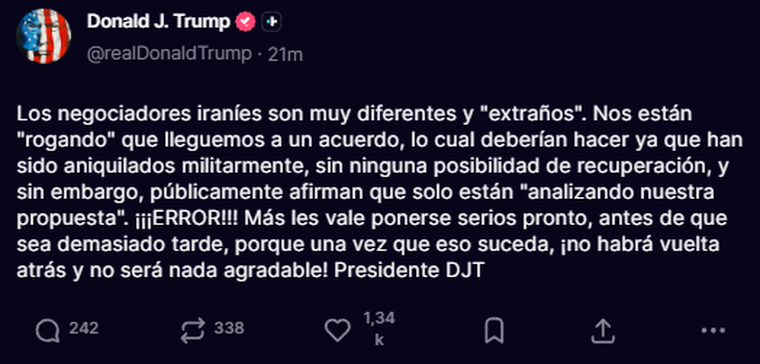 "Los negociadores iraníes son muy diferentes y 'extraños", comienza el posteo del mandatario. "Nos están 'rogando' que lleguemos a un acuerdo, lo cual deberían hacer, ya que han sido aniquilados militarmente sin ninguna posibilidad de recuperación, y sin embargo, públicamente afirman que están 'analizando nuestra propuesta' ¡ERROR!", amplió.