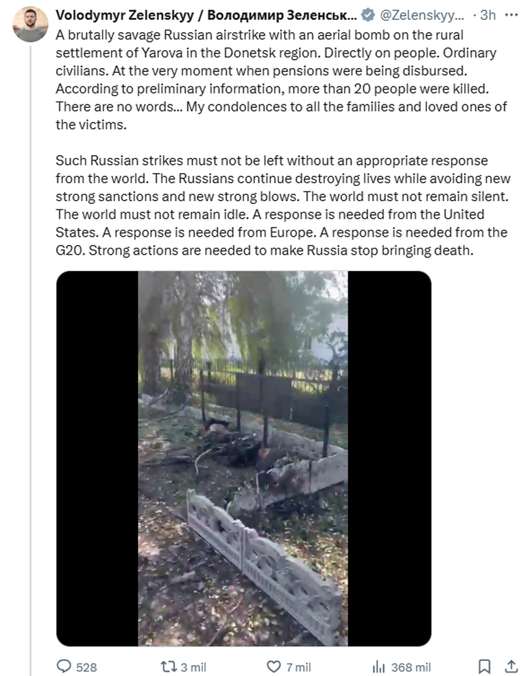 “Un salvaje ataque ruso con una bomba aérea sobre el pueblo de Yarova, en la región de Donetsk, mató a más de 20 civiles”, denunció Zelenski en sus redes sociales. Junto al mensaje, el mandatario ucraniano difundió un fuerte video que muestra los cuerpos de las víctimas tendidos cerca de la camioneta que distribuía los pagos, muy dañada.