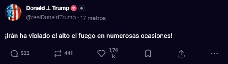 "¡Irán ha violado el alto el fuego numerosas veces!", afirmó Trump, detallando que gran parte de estas agresiones ocurrieron en el Estrecho de Ormuz contra cargueros de Francia y el Reino Unido. Para la Casa Blanca, estos incidentes representan una ruptura total de los términos acordados el pasado 7 de abril, cuando se estableció la tregua de dos semanas que expira este miércoles.