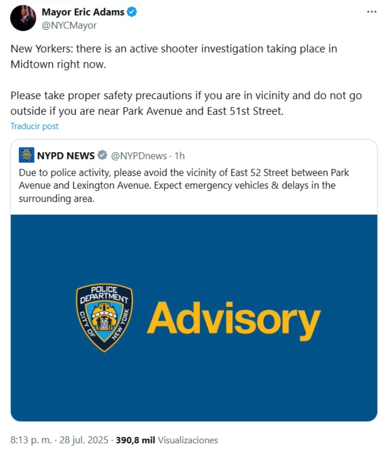 Eric Adams se refirió en su perfil de X a la investigación en curso y se dirigió a la comunidad local: "Por favor, tomen las precauciones de seguridad adecuadas si se encuentran cerca y no salgan si están cerca de Park Avenue y la calle 51 Este".