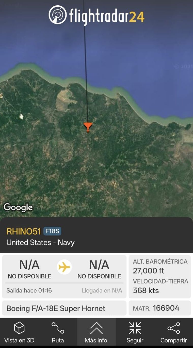Un caza F-18 de la Marina de los Estados Unidos cruzó por primera vez el espacio aéreo de Venezuela, en un hecho inédito que generó fuerte inquietud en ámbitos militares y diplomáticos de la región. El episodio ocurrió en las últimas horas y fue detectado por plataformas especializadas en rastreo aéreo.