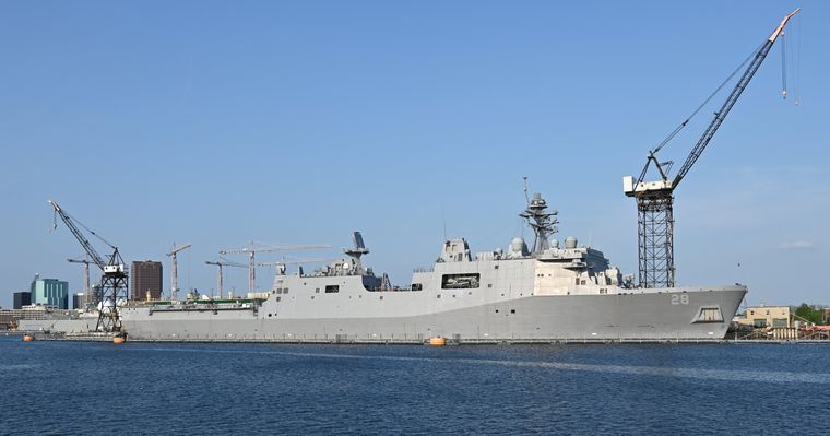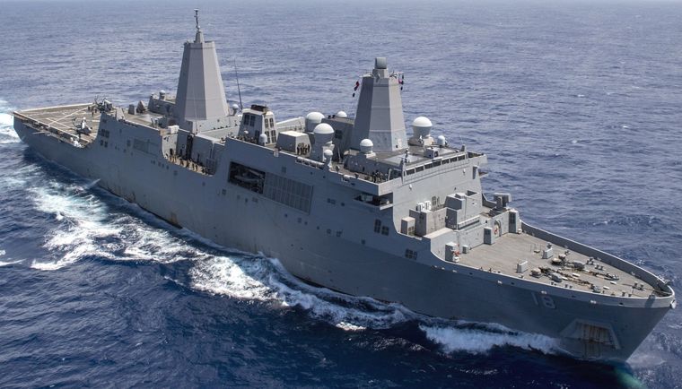 - USS San Antonio: es un buque muelle de transporte anfibio capaz de transportar a más de 700 infantes de marina, además de su tripulación. Dispone de un dique inundable para operar con lanchas de desembarco y vehículos anfibios, y una cubierta de vuelo preparada para helicópteros y convertiplanos MV-22 Osprey. Su armamento incluye sistemas de defensa aérea de corto alcance y cañones automáticos, lo que le brinda protección ante amenazas cercanas. Por su versatilidad, puede participar tanto en operaciones anfibias como en misiones humanitarias.