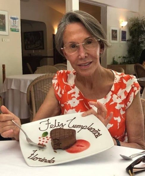 En la postal luce una hermosa blusa naranja con estampados blancos y está sentada a la mesa con un plato en el que se alcanza a leer "Feliz cumpleaños Florinda" con un delicioso pastel de chocolate en forma de corazón. Lleva unas gafas y no tiene una gota de maquillaje en su rostro.