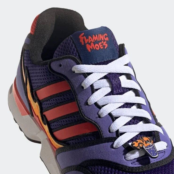 Cualquier fanático recordaría el episodio donde el cantinero Moe le roba la bebida a Homero. Se trata de un hecho que tiene lugar en la temporada 3, cuando aparece la icónica “La Llamarada Moe”. ¿Cómo representó Adidas esa escena en una zapatilla? Usó los colores morado y azul oscuro para ambientar la paleta de colores de la escena. Además, en los cotados, el calzado tiene bordadas las llamas de fuego, tal cual las tiene el trago.