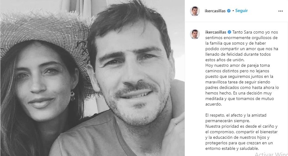 Tras unos días sin pronunciarse al respecto, Iker Casillas y Sara Carbonero confirmaron su separación. A través de una publicación en Instagram, el exportero y la periodista emitieron un sentido comunicado acompañado con una fotografía en la que aparecen ambos: Se han dedicado unas bonitas palabras asegurando que entre ellos sigue existiendo mucho amor.