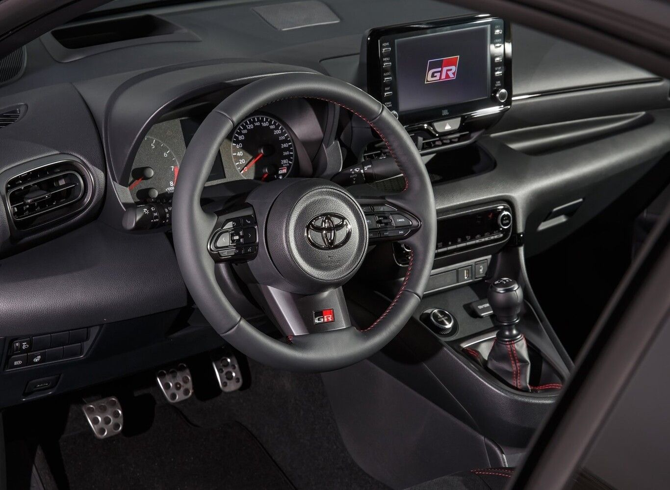 Adentro, el Toyota GR Yaris combina el espíritu racing con las comodidades de un vehículo de calle. Sobresale el volante tapizado de cuero, los asientos deportivos forrados en gamuza, las costuras rojas, la pantalla táctil de 8 pulgadas y los pedales de aluminio. Su precio: $699,900 pesos.