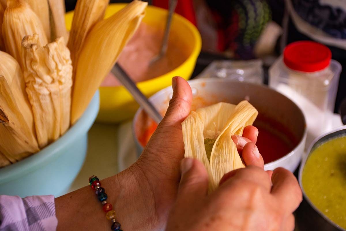 Una vez listo el relleno, acomoda una porción al centro de cada hoja de maíz cubierta con su respectiva película de masa. Cubre el relleno con otro poco de masa, para luego doblar y cerrar la hoja, y finalmente amarrarla.