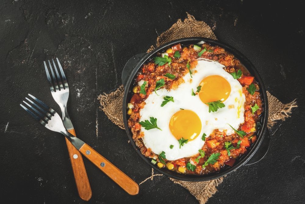 Los huevos rancheros son un desayuno tradicional de México que consiste básicamente en: huevos fritos sobre tortillas de maíz con una salsa hecha de tomates, chiles y otros vegetales picados.