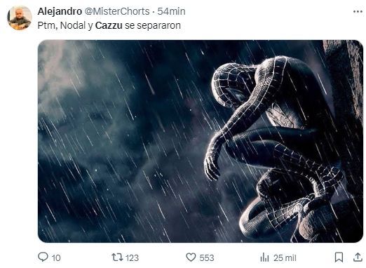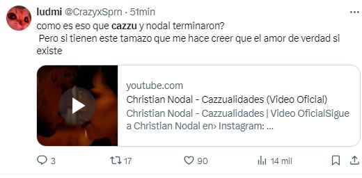 De inmediato, los usuarios de las redes sociales compartieron su opinión y algunos memes respecto de la ruptura entre los intérpretes de “Cazzualidades”. Por una parte, están quienes se pusieron tristes debido a que parecían formar una linda relación, mientras que otros aseguraron que sería lo mejor para el regreso musical de la artista argentina, quien, además, se está haciendo cargo del cuidado de su hija.