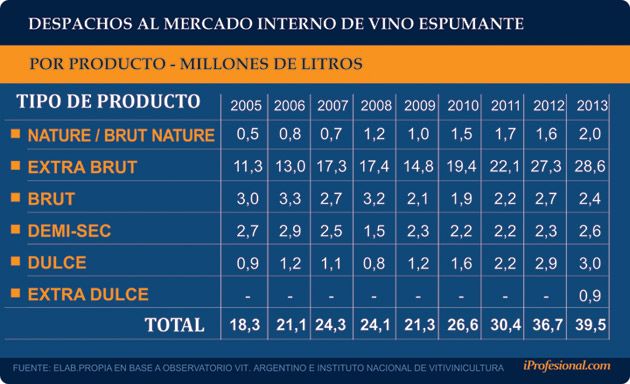 Al analizar el tipo de producto que más se consume, está claro que la demanda se sigue volcando por el Extra Brut, que "monopoliza" 7 de cada 10 litros que se comercializan en el mercado interno.