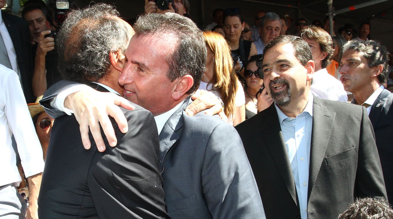 En el carrusel, el abrazo de Daniel Scioli y Francisco Pérez y Carlos Ciurca que los mira de "reojo".