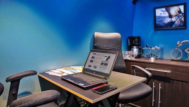 El otro modelo de Transporter T6 presenta un estilo de oficina más convencional. Cuenta con sillas de cuero, un escritorio de madera y fotos de la ciudad como fondo.