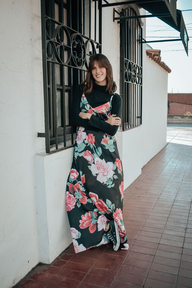 Vestido largo floreado (prenda principal) con polera negra y zapatillas.