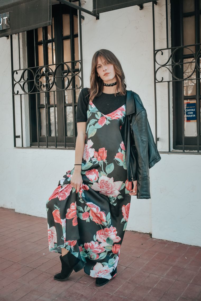 Para una ocasión más de noche, por ejemplo, una cita, una cena, una visita al museo, cambiando solo algunas cosas, le damos otro estilo. Si además sumamos un labial power, ¡le damos el toque que faltaba! Vestido largo floreado (prenda principal), remera negra brillante, chocker con piedras, campera de cuero y botas texanas negras con algo de taco.
