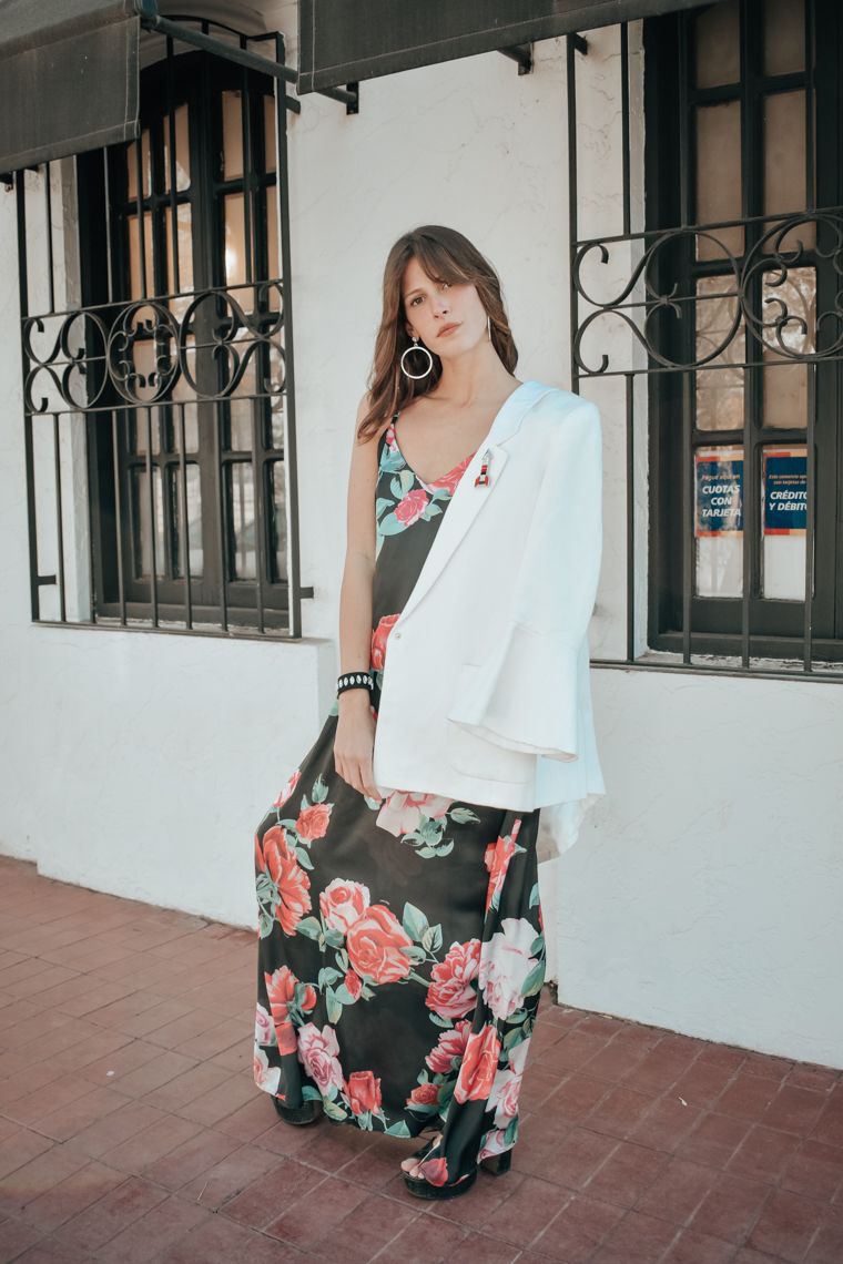 Para un casamiento, ya sea de día o de noche, agregamos accesorios más llamativos y un blazer más formal que puede darle un toque más sofisticado. Vestido largo floreado (prenda principal), sandalias, accesorios como aros y brazaletes, y un blazer blanco.