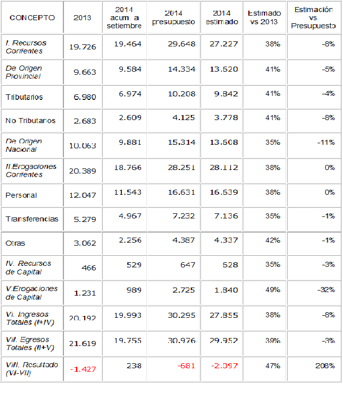 Por último, el Resultado operativo de los primeros 9 meses del año es superavitario en $238 millones, lo que en proporción representa un 1% de los ingresos totales. Esta relación sobre los ingresos y su comparación a la observada el mismo periodo del año anterior, nos permite proyectar para 2014 un Resultado deficitario de $2 mil millones, es decir, el triple de lo presupuestado, y consolidando una serie de déficits fiscales desde el año 2008.
