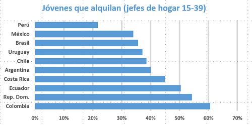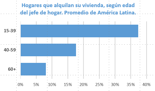 ¿Hay diferencias de género? No mayormente. En promedio, en América Latina el 38% de los jefes de hogar hombres de 15 a 39 años alquila, mientras que el 39% de las jefas de hogar del mismo rango de edad lo hace. Una diferencia no significativa.