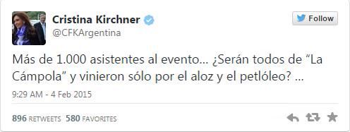 La presidenta escribió en su cuenta: “Más de 1.000 asistentes al evento… ¿Serán todos de ‘La Cámpola’ y vinieron sólo por el aloz y el petlóleo? …”. Esto produjo “indignación” en los chinos (de acuerdo a lo que se pudo leer por ahí) y hasta menciones y análisis en muchos diarios serios del mundo.