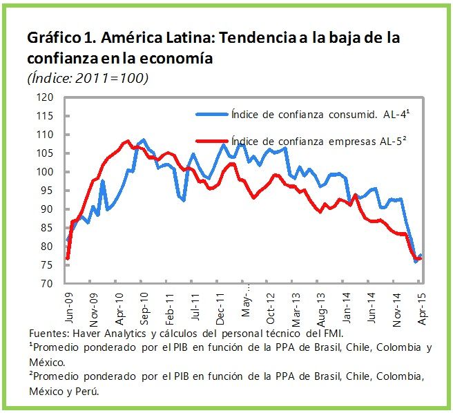 Sin embargo, el crecimiento más débil de lo previsto en Estados Unidos al comienzo del año ha empujado a la baja las perspectivas de crecimiento en México, América Central y el Caribe, mientras que el persistente descenso de los precios de las materias primas ha debilitado aún más el entorno externo para la mayoría de los países de América del Sur. Al mismo tiempo, algunos factores internos se han sumado a las dificultades de carácter externo, contribuyendo a debilitar la confianza de las empresas y los consumidores y, por lo tanto, a reducir la demanda privada (gráficos 1 y 2). Además, la moderación de los precios de las materias primas y el alto nivel de apalancamiento de las empresas implican que la inversión probablemente seguirá siendo débil durante un período prolongado.