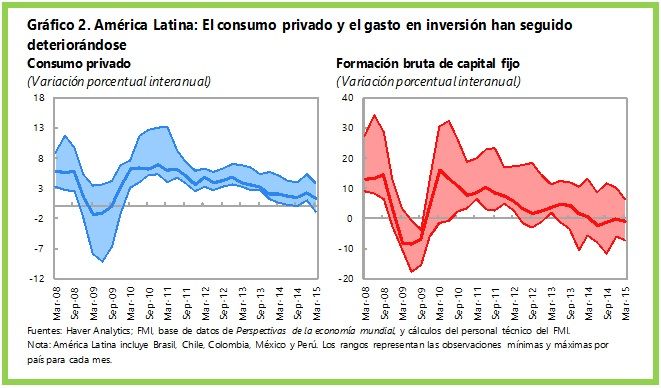 En Brasil el PIB real se contrajo durante los primeros tres meses del año. Los datos preliminares para el segundo trimestre apuntan a un mayor deterioro del entorno económico, incluido el mercado de trabajo, aun cuando la inflación se mantiene en un nivel inquietantemente elevado. Prevemos ahora una mayor contracción en 2015, de alrededor del 1½ por ciento (una tasa de crecimiento ½ punto porcentual menor que en nuestras proyecciones de abril). Esto refleja una contracción significativa de la inversión privada y un descenso moderado del consumo privado, debido al deterioro de la confianza atribuible principalmente a factores internos. Se prevé que la economía brasileña registre una ligera recuperación de alrededor de ¾ por ciento en 2016.