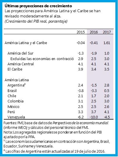 Teniendo todo esto en cuenta, las perspectivas de crecimiento de la región para 2016 y 2017 se han revisado moderadamente al alza, 0,1 puntos porcentuales en ambos años con respecto a lo pronosticado en abril de 2016 (véase el cuadro). Tras una leve contracción de la actividad en la región en 2015, prevemos que este año la actividad económica se contraiga 0,4 por ciento (una ligera mejora frente al -0,5 por ciento de las proyecciones de abril de 2016), con una reactivación moderada del crecimiento en 2017 a 1,6 por ciento. Pero los frecuentes episodios de aumento de la volatilidad del mercado, si bien efímeros, son un constante recordatorio de que las condiciones favorables del mercado pueden trastocarse de la noche a la mañana. Esta volatilidad mundial también podría exacerbar las vulnerabilidades del sector empresarial, dadas las mayores cargas de deuda y la menor rentabilidad.