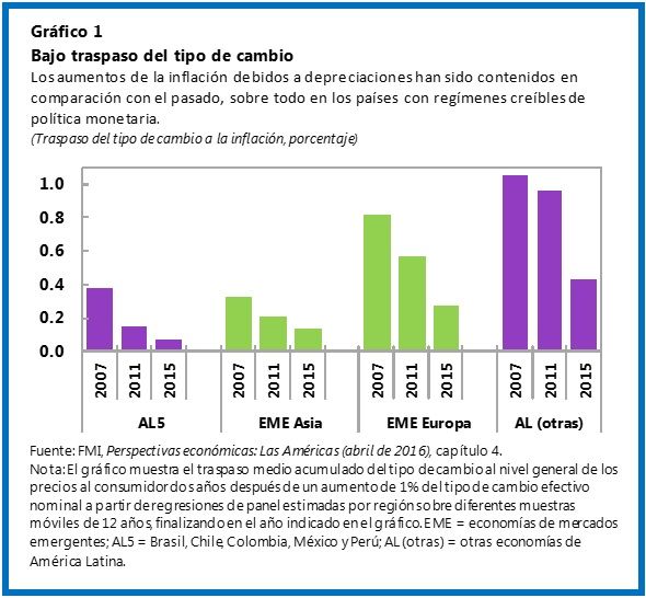 En vista de los considerables shocks de los términos de intercambio y la mayor volatilidad en los mercados financieros mundiales, la flexibilidad del tipo de cambio sigue siendo la primera línea de defensa. Un factor tranquilizador es que en los países que cuentan con regímenes de metas de inflación bien establecidos, el efecto de traspaso de las fuertes depreciaciones del tipo de cambio a la inflación interna ha sido relativamente limitado (véase el gráfico 1). La clara comunicación por parte de los bancos centrales sigue siendo esencial para mantener bien ancladas las expectativas de inflación.