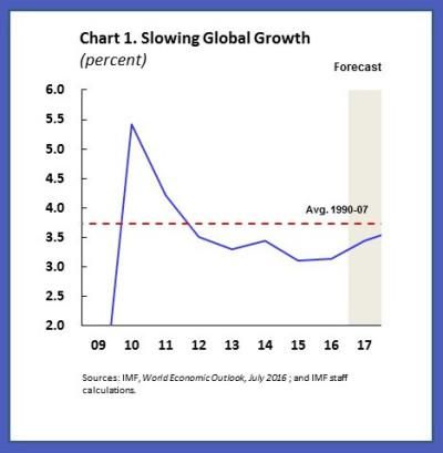 Y justo antes de la cumbre del G-20, el FMI emitió un informe con una previsión de crecimiento aún más débil. "La alta frecuencia de datos apunta a un crecimiento más débil este año, especialmente en las economías avanzadas del G-20, mientras que el rendimiento de los mercados emergentes será más heterogéneo". Y continua: "El panorama global sigue siendo limitado, con una dinámica de crecimiento a largo plazo desfavorable y con disparidades de ingresos nacionales que suponen nuevos desafíos para los gobiernos. Los desarrollos recientes, incluyendo una inflación muy baja, junto con la desaceleración del crecimiento del comercio y de la inversión, confirman ampliamente el modesto ritmo de la actividad global. La disminución de la inversión, agravada por los problemas de sobreendeudamiento del sector privado y los problemas de balance del sector financiero en muchos países, la tendencia a un crecimiento débil de la productividad, así como factores demográficos pesan sobre las perspectivas de crecimiento a largo plazo, lo que reduce aún más los incentivos para la inversión, a pesar de las tasas de interés históricamente bajas. Un período de bajo crecimiento que ha dejado de lado a muchas personas de bajos ingresos, que ha aumentado la ansiedad sobre la globalización y empeorado el clima político para las reformas. El riesgo de decrecimiento sigue dominando".