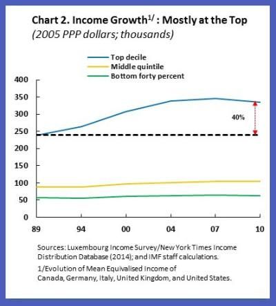 la directora del FMI, Christine Lagarde, también escribió en su blog que "un crecimiento global débil, que interactúa con un aumento de la desigualdad, está alimentando un clima político en el que las reformas se estancan y los países recurren a políticas orientadas hacia el interior. En una amplia muestra representativa de las economías avanzadas, los ingresos del 10 por ciento se incrementaron en un 40 por ciento en los últimos 20 años, mientras que el crecimiento ha sido muy modesto en la parte inferior. La desigualdad también se ha incrementado en muchas economías emergentes, aunque el impacto en los pobres a veces se ha visto compensado por un fuerte crecimiento de los ingresos en general" .