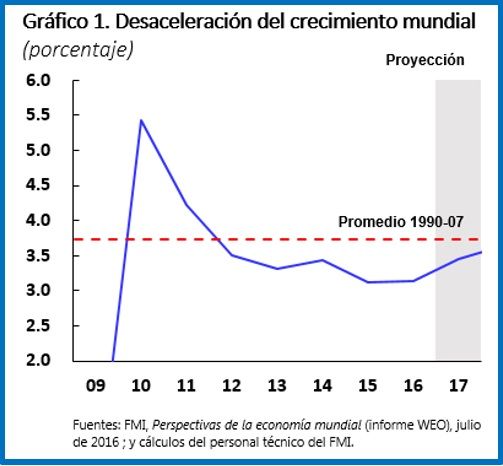 El año 2016 será el quinto año consecutivo con un crecimiento del PIB mundial por debajo de su promedio a largo plazo del 3,7% (1990-2007), y 2017 podría ser el sexto (gráfico 1). Desde principios de los años noventa, cuando los efectos de contagio derivados de la transición económica provocaron una desaceleración del crecimiento, no se ha visto un debilitamiento de la economía mundial por tanto tiempo. ¿Qué ha ocurrido?