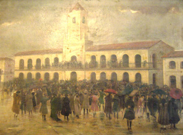Cuadro: "25 DE MAYO Y LOS PARAGUAS". Autor: L. Sánchez de la Peña pintada en 1909. Ilustra el momento en que el pueblo reunido en la plaza reclama al Cabildo. Actualmente en Museo del Cabildo.